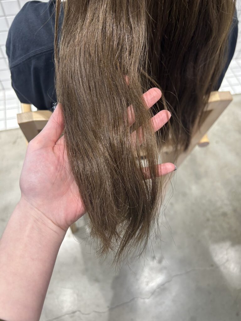 3. 扱いやすいシルエットへ スカスカだった毛先を整えたことで、パサつきが目立たなくなり、ご自宅でのスタイリングもグッと楽になります。ストレートでも綺麗にまとまり、毛先を軽く巻くだけでふんわりとした動きを楽しめます。