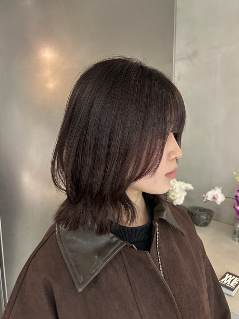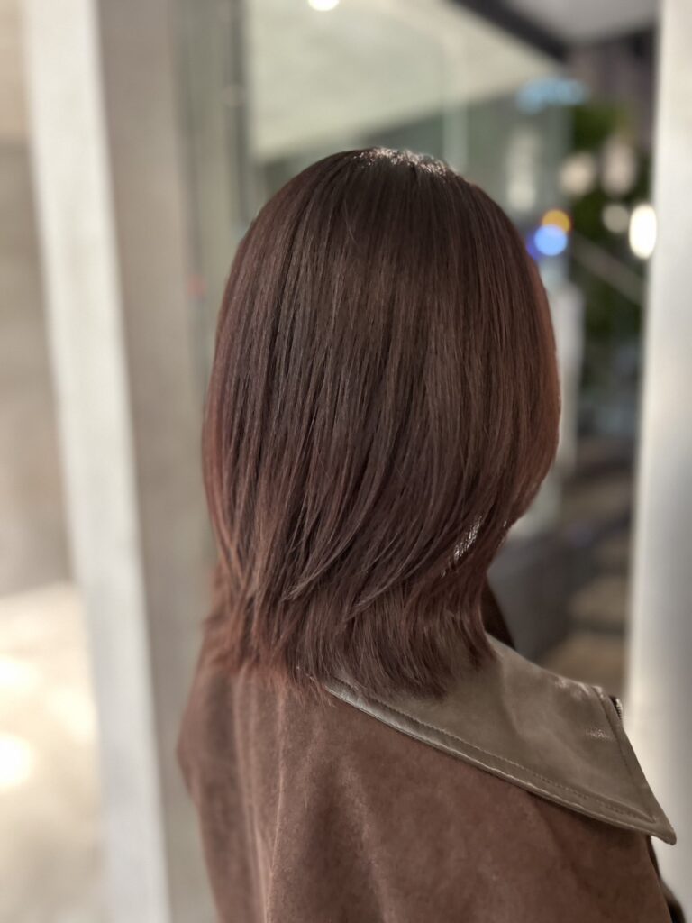 今回のメニューは**【カット+カラー】**です。 「ツヤ感のある落ち着いたカラー」と「まとまるのに軽いカット」の両立を目指しました。